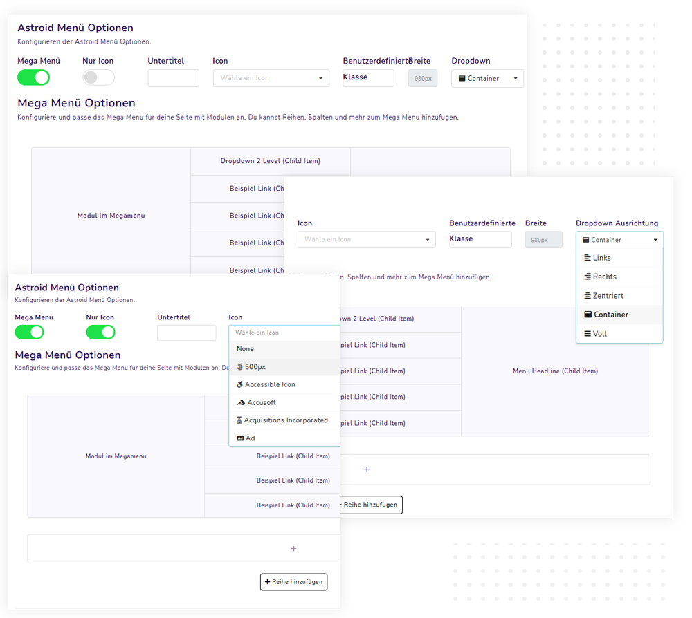 Das framework wird mit einem Mega-Menü-Builder per Drag & Drop geliefert. Sie können Ihre Menüpunkte und Joomla-Module hinzufügen und ein interaktives Mega-Menü erstellen.